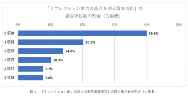 図1は、表1にて定義した「リフレクション能力の高さを測る調査項目」の各5項目に対し、正規雇用の労働者が「そう思う」または「ややそう思う」と回答した項目数(以下「該当項目数」)について示したものです。図1より、該当項目数が5つすべてだった労働者は7.8%であり、全体の1割に満たないことが明らかとなりました。また、該当項目数が1つもない労働者は39.9%であり、全体の4割近くもいることが明らかとなりました。