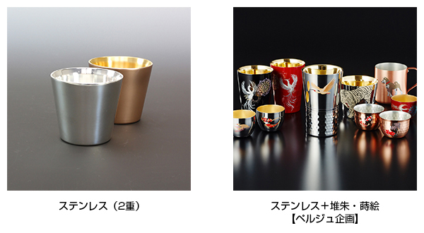 鎚起銅器、ステンレス鋳物、ステンレス(1重)鏡面研磨、ステンレス(2重)、ステンレス+堆朱・蒔絵