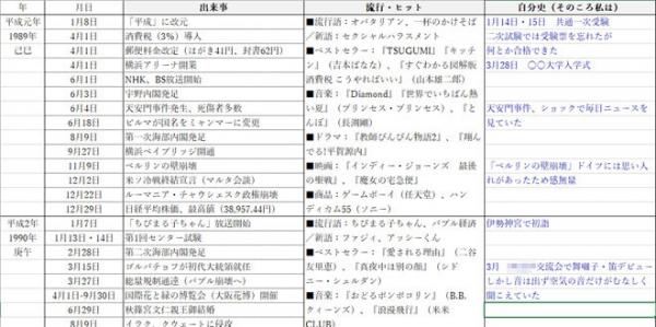 また、合わせて「平成の自分史年表」テンプレートも提供、平成元年から三十年までに起こった出来事や流行を振り返りながら、あの頃の自分、人生のイベントなどを書き綴って完成させます。