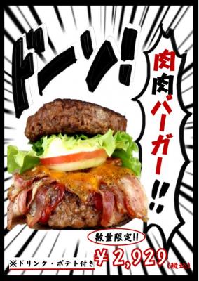 11月29日からの4日間限定、パンの代わりに総量約1ポンド(450g)のパティと自家製ベーコンで挟まれた「肉肉バーガー」を1日限定5個、肉(29)の日にちなんだ2,929円(税込)にて販売致します。