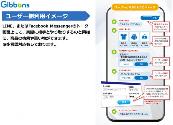 さらにベトナム、タイともにSNSの普及が進んでおり、タイでは「SNSからチャットて?直接の購入経験がある」消費者が増加しています。そこで、当社開発のチャットコマースツール「Gibbons(ギボンズ)」を活用することを提案しています。「Gibbons」は、Facebook Messenger上にて、ユーザーは対話するのと同じ感覚で、商品の検索や購入を行うことが可能です。また、管理者側も商品の登録など一部チャット画面でEC運用が可能となるため、手間をかけずに管理・運営することができます。多言語対応もしております。