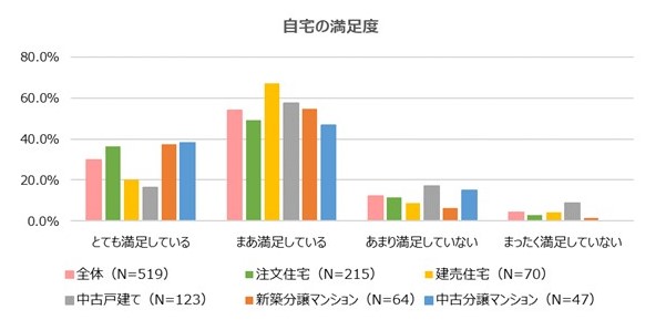 それぞれの居住者に「住まいの満足度」について聞いたところ、『とても満足している』(全体:29.7%、注文:36.3%、建売:20.0%、中古戸建て:16.3%、新築分譲:37.5%、中古分譲:38.8%)、『まあ満足している』(全体:54.1%、注文:49.3%、建売:67.1%、中古戸建て:57.7%、新築分譲:54.7%、中古分譲:46.8%)、『あまり満足していない』(全体:12.1%、注文:11.6%、建売:8.6%、中古戸建て:17.1%、新築分譲:6.2%、中古分譲:14.9%)、『まったく満足していない』(全体:4.1%、注文:2.8%、建売:4.3%、中古戸建て:8.9%、新築分譲:1.6%、中古分譲:0%)となり、中古戸建ては7割超、注文住宅、建売住宅、中古分譲マンションは8割超、新築分譲マンションに至っては9割超の居住者が住まいに満足していることがわかりました。