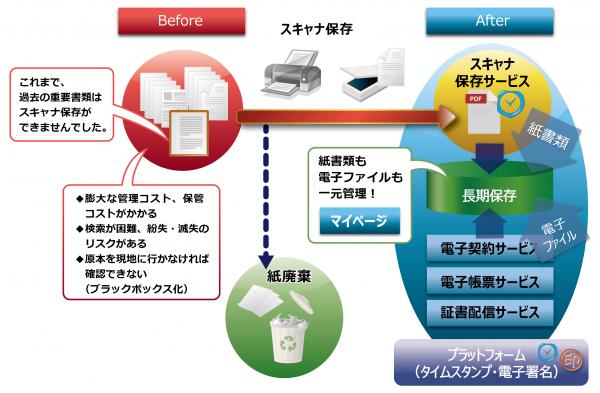 セイコーソリューションズは、従前より展開している電子契約サービスに加え、国税関係書類のスキャナ保存にも対応したクラウドサービスを提供することで、同一プラットフォームで取引の開始から書類の保管・管理まで一連の業務におけるペーパーレス化を実現します。これにより、紙書類の管理や保管にかかるコストの削減、検索性の大幅向上による業務の効率化を推進いたします。