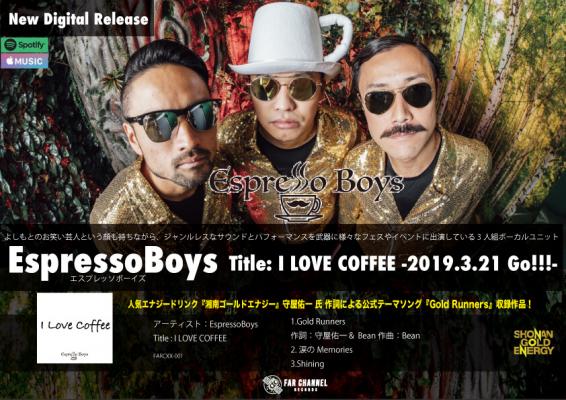 株式会社インセクトノイズの音楽レーベルFar Channel Records所属のアーティスト、よしもとのお笑い芸人という顔も持ちながら、ジャンルレスなサウンドとパフォーマンスを武器に様々なフェスやイベントに出演している3人組ボーカルユニット『EspressoBoys』が『I LOVE COFFEE』を2019.3.21(木)に配信リリースする事が決まりました。