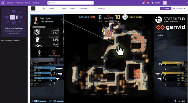 新しいesportsエクスペリエンスには、既存のCS:GOチャンネルの機能であるインタラクティブなリアルタイムマップ、プレーヤースタッツ、および複数プレイヤーのPOVが含まれています。それらに加え、視聴者間のTwitch Extensionでのライブ応援(チャットによる混沌とした応援を減らすことができます)、人気のあるStatsHelix CS:GOマップ内でのより詳しいプレイヤーデータの表示など、まったく新しい視聴者間インタラクションが追加されます。