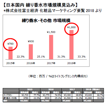 54 億円の内訳はオーデコロン36 億円、練り香水・その他が18 億円となり、この3 年間で練り香水・その他の構成比が、10%アップするとみられています。この練り香水市場規模増加の要因は、当社が2016 年から展開する「パフュームスティック(R)」をはじめとする、スティック型の練り香水。