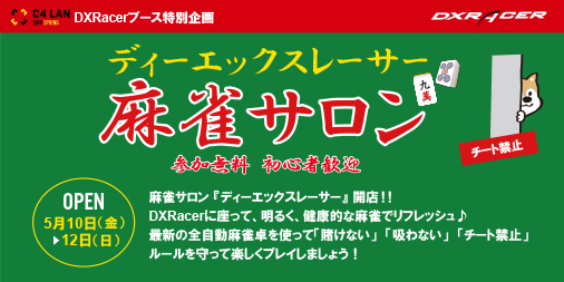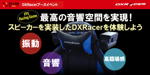 日本総輸入販売元であるルームワークス(本社:兵庫県川西市、代表:花田 俊祐)は、 5/10(金)〜5/12 (日)に開催される国内最大のゲーム持ち込みイベント(LAN-PARTY)である 『C4 LAN 2019 SPRING』へ機材サポートを行う。 当日は、合計130台を超えるDXRacerゲーミング&eSportsチェアを当イベントに持ち込みます。イベント期間中、会場内DXRacerブースでは、DXRacerとして、初めての試みである、振動・音響、高臨場感で最高の音響空間を創り出す高性能スピーカー(開発中)を実装したモデルをブース内に設置し、FPS&レーシングゲームの体験試乗を行う予定。また長時間快適に座ることを主眼に開発された当社ゲーミングチェアを使っての、来場者限定イベント 『ディーエックスレーサー麻雀サロン』 をブース内にオープン、大ビンゴ大会や、1円スタート売り切りオークションなども開催予定。