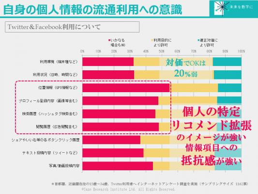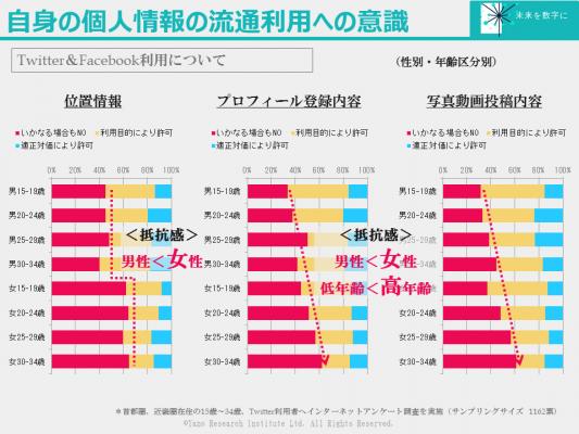 矢野経済研究所 未来企画室「未来を数字に」プロジェクトでは、利用者が多く代表的なSNSであるTwitter、Facebook利用を対象に、個人情報の流通利用に関する若者(首都圏、近畿圏在住の15歳から34歳男女1,744人)の意識について調査・分析いたしました。今回、調査分析した内容は、自分自身の個人情報について、(1)情報種別に流通利用させることへの意識、(2)流通利用させることに対して求めたい対価の2つです。