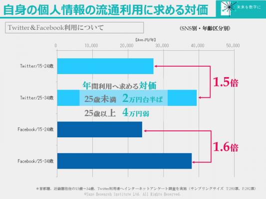 Twitterの場合の前者の平均は27,150円/年、後者の平均は39,409円/年で大よそ1.5倍の差が、Facebookの場合はそれぞれ24,016円/年、37,939円/年で1.6倍の差がありました。この結果は、それぞれの年齢層における金銭価値に対する認識の差が大きく影響していることは容易に想像できます。