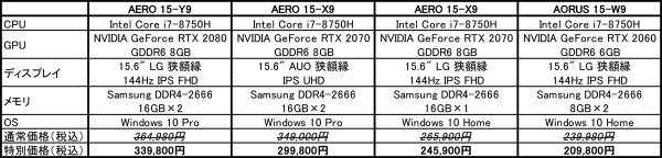 本プロモーションの対象となるのは、15.6インチの狭額縁液晶ディスプレイを採用した高性能薄型ノートPCの「AERO 15シリーズ」と、ゲーム性能を追求しCPUやGPUの冷却性を高めた「AORUS 15シリーズ」の、NVIDIA GeForce RTX 20シリーズ搭載モデルです。