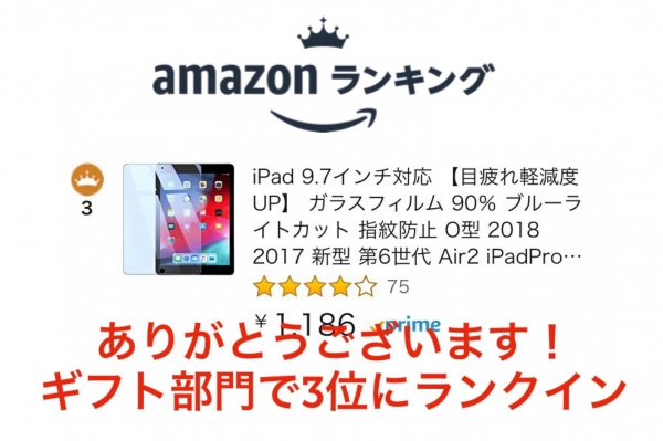 モバイルアクセサリー関連の商品開発や製造・販売を手がけるWANLOK 合同会社(本社:東京都渋谷区、運営責任者:菅原克仁)の製造販売している、アップルコンピュータ社製「iPad 9.7インチ」対応のガラス保護フィルム『TEMPERED GLASS SCREEN PROTECTOR 』(ブルーライトカット版)が、この度ついに、6月13日(木)付のAmazonランキングのギフト部門にて、堂々の3位入賞を果たしました。6月11日に再入荷したばかりのこちらの商品は、販売再開後、爆発的な売れ行きをマークし続けています。