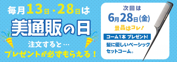 毎月13日と28日は「美通販の日」!プロ向け美容材料の通信販売サイト「美通販」が、6月28日(金)に注文された方全員に、「髪に優しいベーシックセットコーム」1本をもれなくプレゼント!