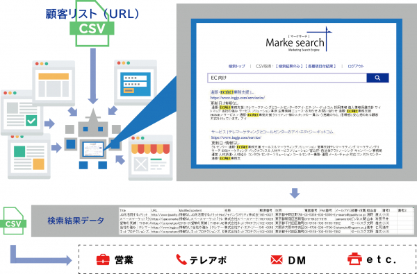 「マーケサーチ」はクローラー、データベース、検索、の3機能を兼ね備えます。あらかじめユーザーが登録した複数の顧客Webサイトをクローラーが自動的(定期的)に巡回しクラウド上にDB化します。そして、ユーザーは最新の顧客情報をWebブラウザ上から自由にキーワード検索でき、さらに結果一覧をCSV形式でダウンロードすることが可能となります。