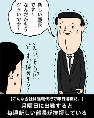本コンテンツの第一弾のイラストとして「こんな会社は退職代行で即日退職だ。|月曜日に出勤すると毎週新しい部長が挨拶している」の掲載をしています。今後も随時新しいオモシロイラストを提供して参りますので、お時間のあるときにチェックしていただけると嬉しく思います。