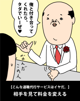 本コンテンツの第一弾のイラストとして「こんな退職代行サービスはイヤだ。|相手を見て料金を変える」の掲載をしています。今後も随時新しいオモシロイラストを提供して参りますので、お時間のあるときにチェックしていただけると嬉しく思います。