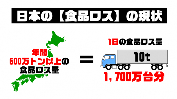 食品ロスとは、売れ残りや賞味期限が近い等、様々な理由で、『まだ食べられるのに食品が廃棄されてしまう』ことを言います。現在、日本では年間600万トン以上の食品ロス量と言われており、国民1人当たり、毎日約139g(茶碗約1杯のご飯)相当、年間に換算すると約51kgの食品ロス量と言われております。どういう量かというと、毎日1日当たり10トン車の大型トラック約1700台分、年間量で言うと1人当たりの年間コメ消費量約54kgと同等量です。この我が国の食品ロス量は、世界中で飢餓に苦しむ人々に向けた世界の食料援助量、年間約380万トン(平成29年)の約1.7倍に相当します。 (※農林水産省HP、消費者庁HP、政府広報HPより)