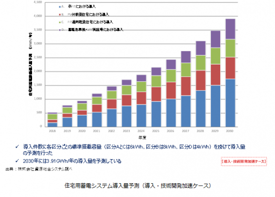 分散型電源の筆頭を担う太陽光発電システムにとって欠かせないパートナーである「蓄電システム」について、今回初めて価格・導入量を予測しました。卒FITなどをきっかけに、住宅用蓄電システム(定置用蓄電池やV2H(Vehicle to Home)システムなど)導入量が拡大し、2030年度には最大で3,900MWh/年に成長する可能性があります。一方、需給一体型市場成長などを受けて産業用蓄電システム導入量も拡大、2030年度には最大で4,000MWh/年に成長する可能性があります。