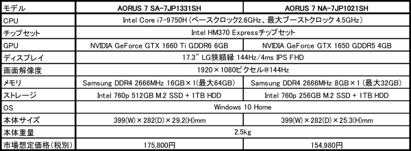 2019年10月4日 - GIGABYTE Technology Co., Ltd. 台湾・新北市 - コンピュータテクノロジーで世界をリードするGIGABYTE Technologyは、144Hz/4ms表示に対応したLG製17.3型IPSパネルを採用したゲーミングノートPC「AORUS 7 SA-7JP1331SH」と「AORUS 7 NA-7JP1021SH」の2製品を10月5日に発売いたします。市場想定価格(税別)は、それぞれ175,800円と154,980円です。