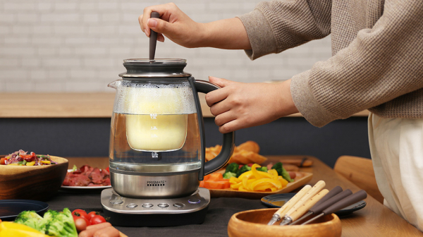 パパッとお湯を沸かしたいときも、サイフォン風コーヒーを作りたいときも、チーズフォンデュパーティーだって、このスタイリッシュなガラスのケトルにすべてお任せ。あなたの生活に寄り添って、食卓をもっと便利にもっと楽しく彩ります。