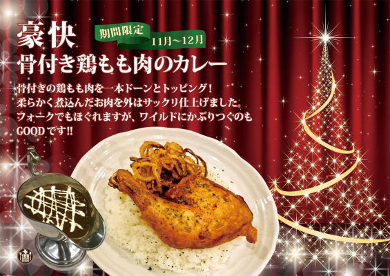 クリスマスシーズンに向けて骨付き鶏もも肉を丸ごとトッピンしたカレーです。