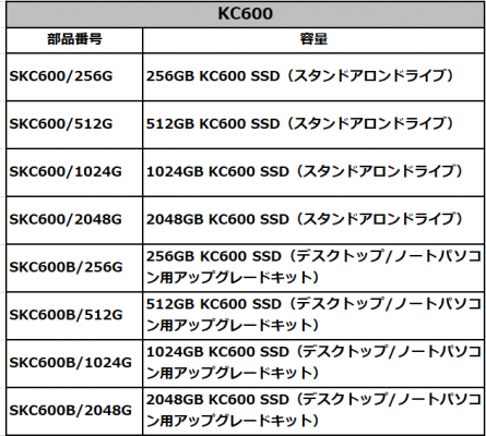 KC600の容量は現在256GBと512GBがあり、1024GBと2048GBがまもなく発売予定です。KC600は5年間の限定保証と無料テクニカルサポートに加えて、Kingstonが誇る信頼性を備えています。詳細については、www.kingston.comをご覧ください。