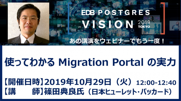 EDBは日本ヒューレット・パッカード株式会社 篠田典良氏を講師に「使ってわかる Migration Portal の実力」と題するウェビナーを2019年10月29日ランチタイムに開催いたします。