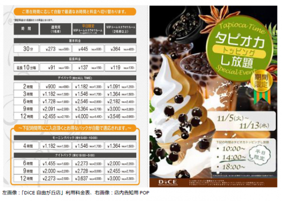 273円(税別)で タピオカをトッピングし放題 11月5日〜11月13日までの期間限定でインターネットカフェ「DiCE 自由が丘店」にて提供