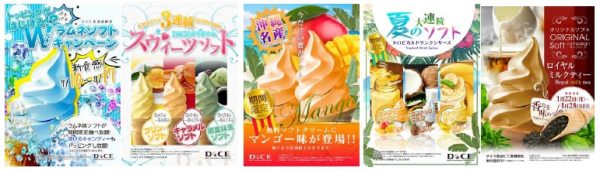 SNS上で、“ソフトクリーム選挙“を開催したり、定期的にソフトクリームに関するアンケートを実施、また様々な企業ともコラボを実施(不定期)、毎年夏にはオリジナルのソフトクリーム※を開発する等、他店では味わえないDiCE独自のソフトクリームを提供しています。