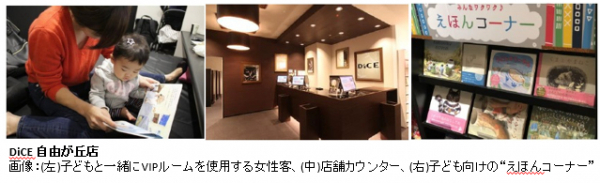 2014年に開業。「DiCE 自由が丘店」では、3.3m×2.0mの完全防音個室タイプのVIPルーム(全17席)が小さなお子様を持つお母様たちに人気です。(未就学児のお子様のご利用は無料です)小さなお子様連れのお客様が増えてきているため、親子でより楽しい時間を過ごす事ができるよう子供向け絵本コーナーも設置しています。