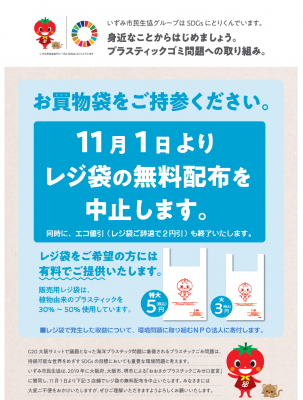 大阪いずみ市民生協では、レジ袋辞退者に2円の値引きを実施したり、オリジナルエコバッグを新規加入者に無料配布するなど、マイバック持参運動をすすめてまいりましたが、11月1日より堺市域のコープのお店についてはレジ値引きを終了し、レジ袋については3円<サイズ大>・5円<サイズ特大>の有料方式に変更します。また、他地域のコープのお店についても、同方式に変更する準備をすすめています。