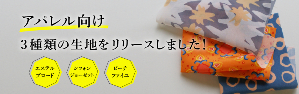 オリジナルのワンピースやブラウス、スカート作りに使える「シフォンジョーゼット」が新登場しました。布の質感はフワッと柔らかく、軽くて薄い透ける素材です。上品でフェミニンな洋服作りにぴったりな素材です。素材はポリエステル100%、昇華転写プリントで加工をしています。価格は1m2,700円(税抜)、納期は5営業日です。