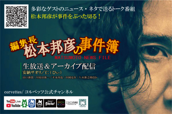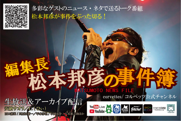 ロックバンド「corvettes/コルベッツ」のリーダーでヴォーカリスト松本邦彦が「編集長」に扮して「ニュース」を持ち込んでくる記者役となる「ゲスト」のネタをキャスト(出演者)たちでトーク展開する新番組『松本邦彦の事件簿』のスペシャル版2回目を2019年12月21日(土)に日本プロデュース合同会社の制作で配信します。