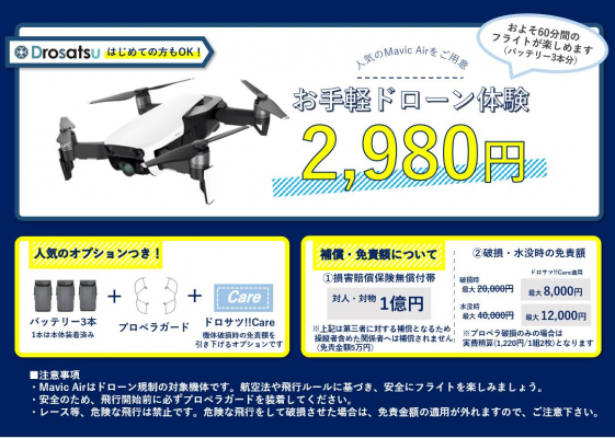 ドローンレンタルサービス「Drosatsu!!」、岐阜県・飛騨市で、その場で借りられる“ドローン(Mavic Air)レンタル”サービスを開始
