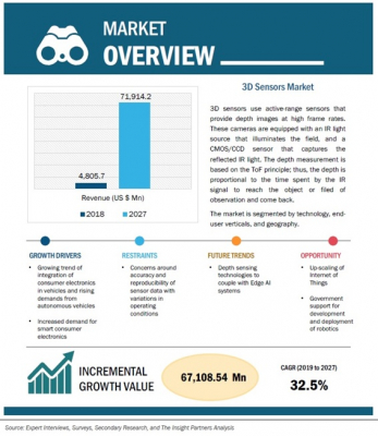 3Dセンサーの世界市場、2027年に719億1,420万米ドル規模へ到達見込み(The Insight Partners発行レポートより)