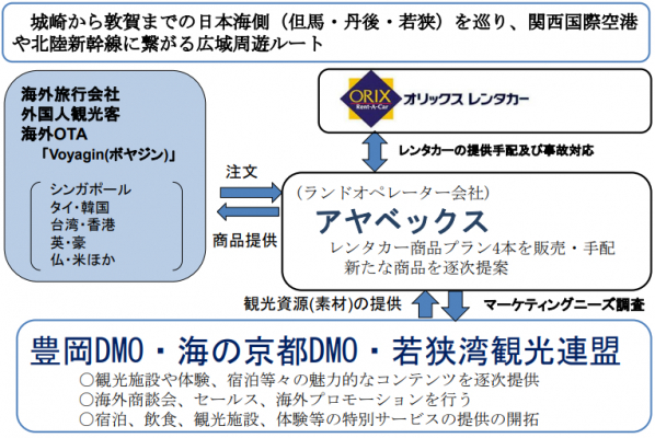 豊岡DMO(一般社団法人 豊岡観光イノベーション)、海の京都DMO(一般社団法人 京都府北部地域連携都市圏振興社)、一般社団法人若狭湾観光連盟の観光関係3団体と、ランドオペレーターのアヤベックス株式会社、レンタカー事業を行うオリックス自動車株式会社が連携し、北関西の魅力を体験できるインバウンド(訪日外国人)向け滞在周遊型商品「海のある北関西のドライブツアー」を造成し、3月3日から販売を開始します。DMOとレンタカー会社、ランドオペレーター会社が協力し、提供する新たな旅行商品となります。
