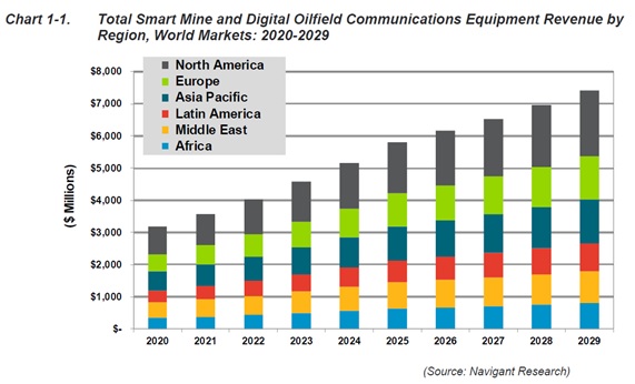 スマート鉱山および上流のデジタル油田生産拠点のネットワークおよび通信機器への総投資予測は、2020年には約32億ドルと推定されています。NavigantResearchは、次の10年市場は年間10%を超える複合年間成長率(CAGR)で成長すると考えています。