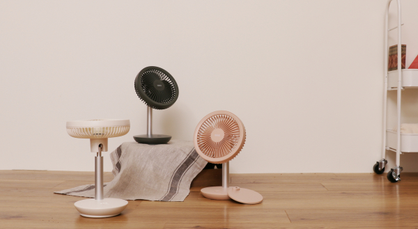 リビングの扇風機が充電式に。ここまで小さくなりました。充電スタンドがついたコードレスミニリビングファンが新登場!