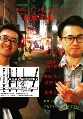 うすくら屋(代表取締役臼倉周右、所在地東京都目黒区)は単独ライブを行います。タイトル「夜会工場」は中島みゆきさんの曲名からつけました。夜会工場と名付けたのは前回の単独ライブで必ず夜に集まってネタをたくさん作った様から名付けました。今回も漫才、コント、タップダンス色々やります。そんなわけで皆様のご来場心よりお待ちしております!