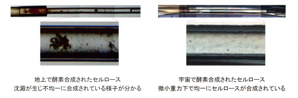 セルロースは地球上に最も豊富に存在し再生可能な生物資源(バイオマス)ですが、水よりも重い比重のために地上で酵素合成すると重力によって沈澱します。一方、宇宙の微小重力環境下では、物質は重さにより沈澱することなく均一に混ざり、結晶は自然対流の影響を受けることなく成長することが知られています。そこで今回、世界ではじめて宇宙でのセルロース酵素合成を試み、地上とは異なる均一なセルロースを得ることができました。今後、宇宙環境で得られたセルロースの構造解析を進め、その特性を明らかにしていく予定です。地上と異なる構造・性質のセルロースが得られることにより、新たな素材研究の可能性を切り開くものと期待されます。
