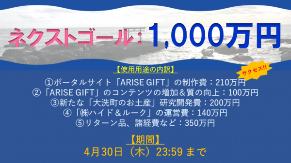 昨年4月に茨城県大洗町で起業し、「町が生き続けるための仕組み作りを行う」というミッションを掲げ活動している「株式会社ハイド&ルーク」が、町の新しいポータルサイト『ARISE GIFT』の制作にあたり、その資金調達手段としてCAMPFIREを通じたクラウドファンディングを実施しております。3月10日に支援額が目標の300万円を突破致しました。 この度、ネクストゴールを設定すると共に、リターン品の追加を行いましたので、お知らせ致します