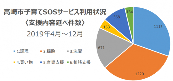群馬県高崎市(市長:富岡 賢治)は、「子育てSOSサービス」の2019年4月から2019年12月までの利用状況をまとめ本日発表しました。このサービスは、子育て環境の充実を目的に全国でも類を見ないもので、電話1本で子育てや家事の経験のあるヘルパーが自宅に駆け付け、家事全般や育児を手伝うものです。
