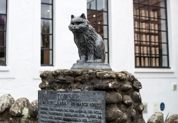 その生涯で28,899匹のネズミを捕獲したとして、ギネス記録にも認定されているウイスキーキャット「タウザー」。原料となる大麦を害獣から守るため、蒸溜所で猫が飼われていることは珍しくありません。そのため「良いウイスキー蒸溜所には必ず猫がいる」と言われています。蒸溜所内には今でも世界で最も有名なウイスキーキャットとして、彼女の銅像が建てられています。