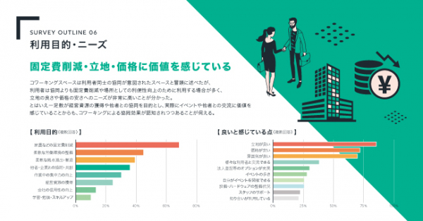 コワーキングスペースは他者との協同を意図して設計されている場合が多いものの、調査の結果からは、コストの低減や利便性の高い労働環境に価値を感じて利用するケースが主流であることが明らかになりました。