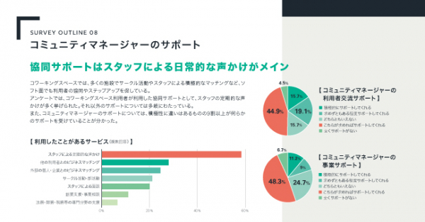 コワーキングスペースでは協同を促進するためのイベント開催やスタッフによるマッチングなど様々な仕掛けがありますが、利用者はそうしたサービスを十分に活用できていない実態が明らかになりました。