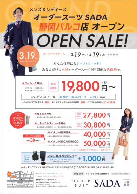 3/19(木)10時00分OPEN! 全国54店舗目!! 工場直販オーダースーツSADA「静岡パルコショールーム」グランドオープンのお知らせ