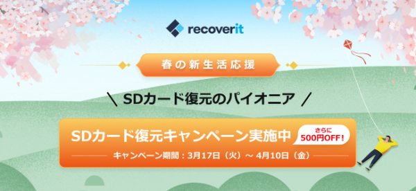 SDカード復元のパイオニアRecoveritは強力な復元ソフトで、貴重なデータを守ります。この度、ワンダーシェアーソフトウェアはSDカード復元を支援するために、Recoveritは「春の新生活応援キャンペーン」を行います。キャンペーン期間にRecoveritをご購入頂くと、全ての料金プランから500円OFFになります。この機会をお見逃しなく。