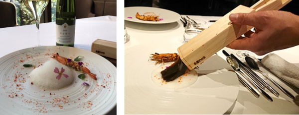2皿目の「清流の飛沫 - 車海老 コキアージュ オマール -」は、清流で勢いよく海老が跳ねて飛沫が飛び散る情景をイメージしています。海老の周りに付けられたライスパフの香ばしさと、泡のソース、海老のビスクのゼリーを組み合わせ、それぞれ違う味と食感が楽しめます。海老のビスクのゼリーは、目の前でところてん突きで仕上げる演出も、従来のフレンチの枠を超えています。