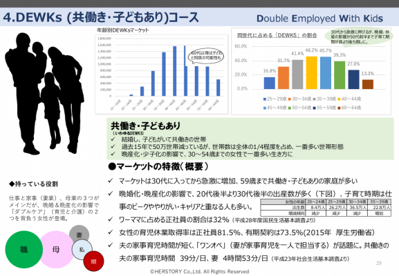 弊社は、従来のマーケティングを女性視点で見直すマーケティング理論「女性視点マーケティング」の導入&支援により企業様の課題解決をサポートしている会社です。長年行っている女性動向の研究&分析報告や女性マーケット攻略のためのノウハウを研究レポートにまとめ提供しています。