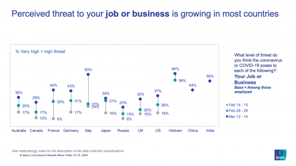 これに加えて、ウイルスの世界的大流行が拡大するにつれて、自分の仕事が危険にさらされていると考える人が増えています。イタリア(63%、+36ポイント)では、経済封鎖を懸念してこの数字が前回調査と比較して大幅に増加しました。フランス(44%、+14ポイント)、イギリス(33%、+13ポイント)がそれに続いています。