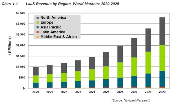 LaaSは、新規またはアップグレードされたシステムのすべての段階を通じて、長期的な顧客関係を提供します。この新しいビジネスモデルと長期的な関係の強化により、プロバイダーのエコシステムは変化しています。照明メーカーは、既存の顧客との関係を拡大することにより、ターンキーサービスを提供する役割を拡大しています。照明ベンダーを超えて、すでに改装や施設管理に関与している企業は、設計から設置、管理、システムメンテナンスまでの照明のアップグレードのすべての段階でサービスを提供することにより、LaaS市場での基盤を獲得できます。 Navigant Researchは、2020年の世界のLaaS収益を9億9250万ドルと推定し、2029年までに14.3%の年間平均成長率(CAGR)で成長すると考えています。